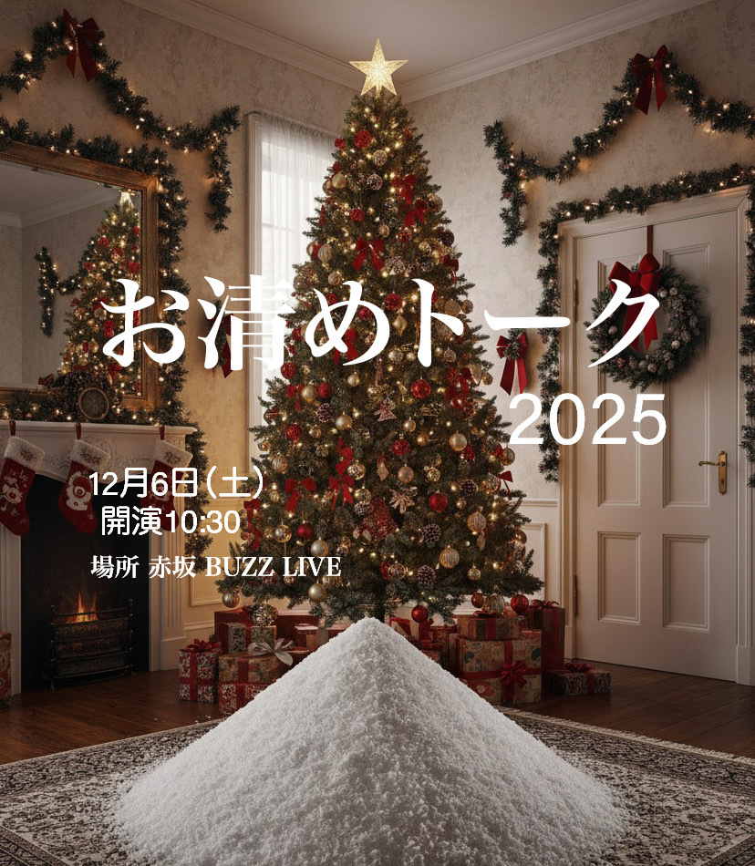 お清めトーク2025 SCHEDULE 2025/12/06(土) 10:30 - BUZZ LIVE 赤坂 『お清めトーク2025』 2025/12/06 (土) 開場 10:20 / 開演 10:30 会場 BUZZ LIVE 赤坂 URLをコピーする 報告する